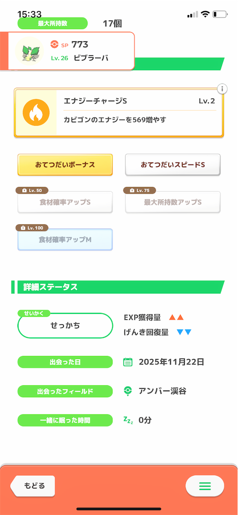 2025-11-27 アンバー渓谷登場キャンペーンの結果 ポケモン ポケモンスリープ とろろのゲーム記録 今回はアンバーの覇権を握るポケモンたちの登場だったので かなり本気で挑みました。 運良く(?)アレルギーが悪化して 寝つきが悪かったおかげで かなり乱獲できたので良かった(体調は良くなかった…)です。 タツベイ アンバー最強木の実要員。 性格無補正ですが、下がっているよりはるかにマシなので採用。きのみSは正義。 ナックラー こちらも性格無補正ですが、 食材AAAが大きいので採用。一応AABも確保してあります。 まとめ キャンペーン中に妥協個体が揃えられたのは 史上初で、ものすごく嬉しいです。しばらくアンバーに籠りつつ、 育成しようと思います。ついでにAAAのピンプクもゲットしたいところです。 ちなみに再来週のデカ盛りウィークのミカルゲは ゲット出来る気がしません笑 それでは〜ランキング参加中ポケモンランキング参加中ゲームブログやってる人の集まり場!